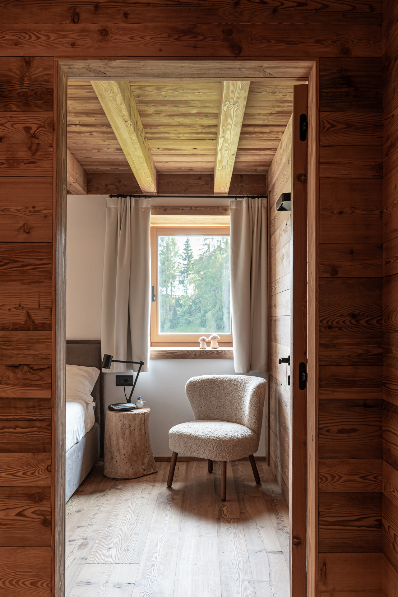 La parete di fondo della prima camera è interamente rivestita in legno spazzolato, che prosegue senza interruzioni inglobando anche la porta, per un effetto visivo continuo e avvolgente. Le venature irregolari e le tonalità calde richiamano l’estetica autentica della tradizione alpina, reinterpretata in chiave contemporanea grazie al disegno ritmico delle assi di diverse larghezze.